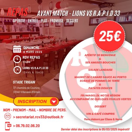 Le Rugby Club Villenavais vous invite à un moment convivial et gourmand avant la rencontre tant attendue contre R.A.P.I.D 33 ! Rendez-vous ce dimanche 9 mars 2025 au Stade Trigan à Villenave d’Ornon pour un repas d’avant-match à ne pas manquer. Un menu savoureux pour une ambiance rugby authentique ! 📍 Où ? Stade Trigan… Continue reading 🏉 Repas d’Avant-Match – Rugby Club Villenavais vs R.A.P.I.D 33 🍽️🔥
